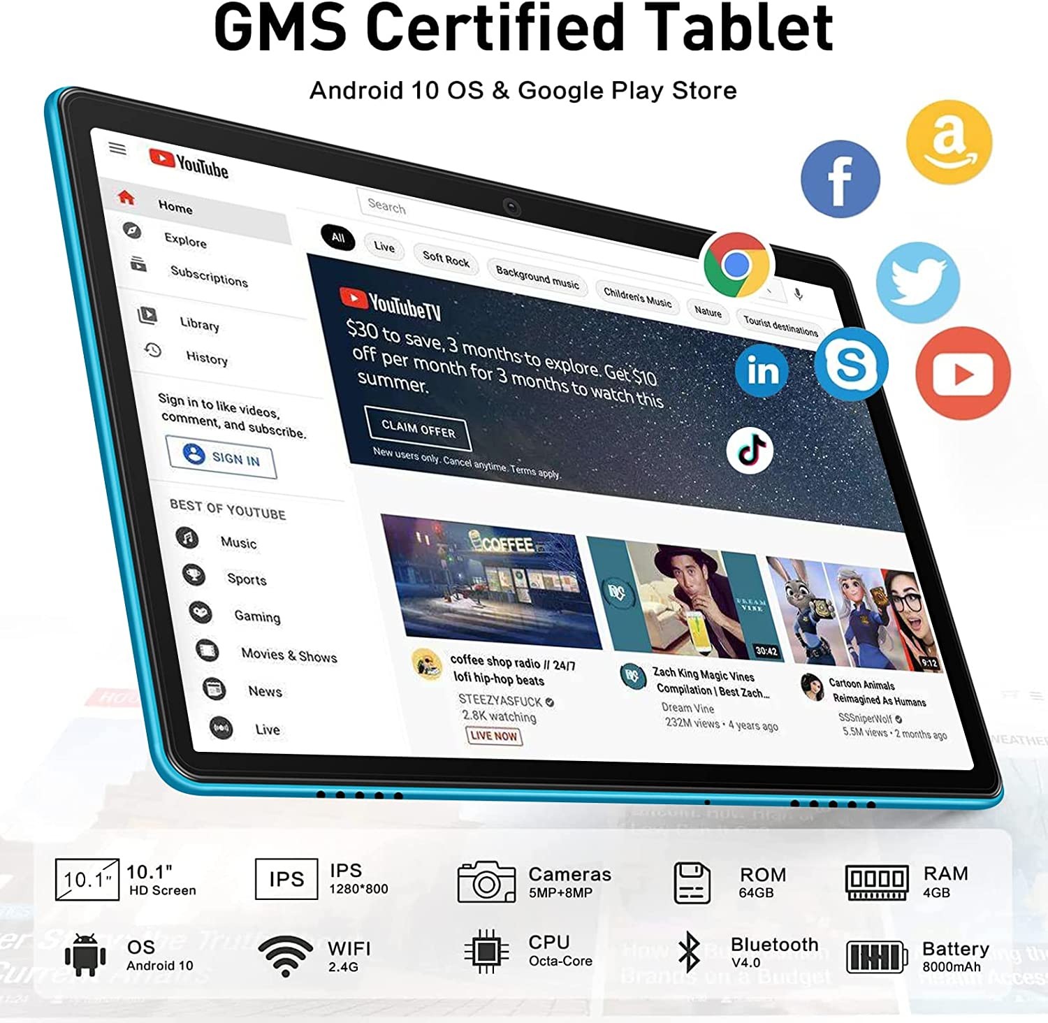 • 【ANDROID 10.0 4 GB RAM】 MEBERRY 10.1-inch tablet with integrated 4 GB operating memory and 64 GB storage memory - up to 256 GB (4--256 GB, applicable), screen resolution 1280x800 IPS and support 8000 mAh battery 7-8 hours video playback (720P and 1080P); 5.0 + 8.0 MP camera support, tablet with dual stereo speakers and fast-transmitting Type C data interface support, TF Card | WIFI | GPS accurate | Bluetooth 4.0 support
